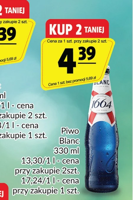 Piwo Blanc o pojemności 330 ml dostępne jest w ofercie Prim Market w cenie 13,30 zł za litr przy zakupie dwóch sztuk, co daje 4,39 zł za butelkę. Pojedyncza butelka kosztuje 5,69 zł, czyli 17,24 zł za litr. To klasyczne piwo, idealne do serwowania schłodzone podczas spotkań ze znajomymi lub jako dodatek do lekkich przekąsek. Kupując dwie butelki, można zaoszczędzić i cieszyć się ulubionym smakiem w korzystnej cenie. Warto skorzystać z tej okazji i zaopatrzyć się w piwo Blanc już dziś.