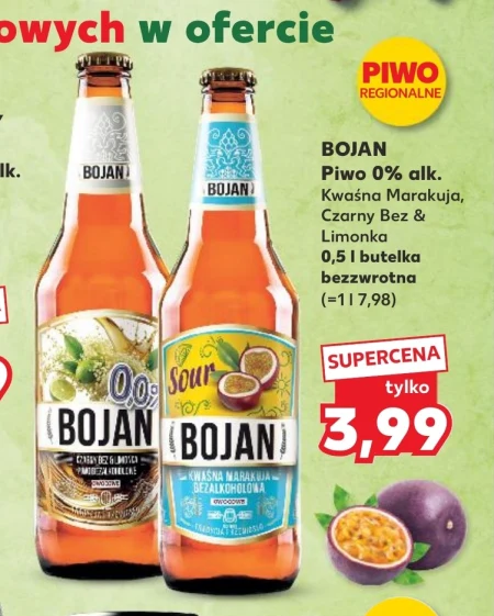 Piwo BOJAN bezalkoholowe o smaku kwaśnej marakui, czarnego bzu i limonki dostępne jest w promocji w Kaufland za 3,99 zł. Napój w butelce 0,5 litra o pojemności bezzwrotnej wyróżnia się orzeźwiającym, owocowym aromatem, który sprawdzi się jako alternatywa dla tradycyjnego piwa lub lekki napój na letnie dni. Idealnie nadaje się dla osób unikających alkoholu, ceniących intensywne smaki i wygodę jednorazowego opakowania. Warto skorzystać z okazji, zanim promocja dobiegnie końca. Oferta ważna od 2026-04-23 do 2026-04-28 Źródło: gazetka Kaufland