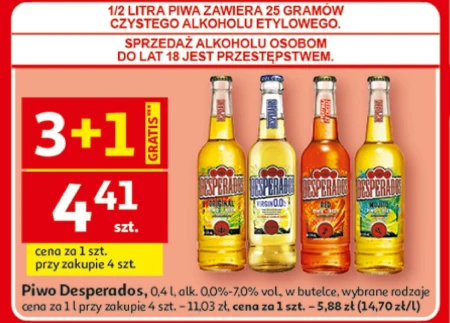 Piwo Desperados, 0,4 l, alk. 0,0%-7,0% vol., w butelce, wybrane rodzaje cena za 1 l przy zakupie 4 szt. – 11,03 zł, cena za 1 szt. – 5,88 zł (24,70 zł/l)
