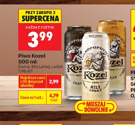 Piwo Kozel 500 ml: Černý, Bílý Lehký, Ležák 7,98 zł/l