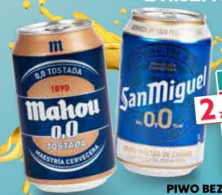 Piwo bezalkoholowe Mahou lub San Miguel, pojemność 330 ml. Cena regularna 3 zł/szt. Cena promocyjna 2,50 zł/szt. przy zakupie 2 sztuk.