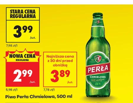 Piwo Perła Chmielowa, o pojemności 500 ml, dostępne jest w ofercie Biedronka w cenie 2,99 zł za sztukę, co przekłada się na 5,98 zł za litr. To klasyczne piwo o orzeźwiającym smaku, idealne na chwilę relaksu lub spotkanie ze znajomymi. Aktualna cena jest korzystniejsza niż najniższa z ostatnich 30 dni, wynosząca 3,89 zł za butelkę. Warto skorzystać z tej okazji i zaopatrzyć się w ulubione piwo w atrakcyjnej cenie. Oferta ważna od 2026-04-13 do 2026-04-18 Źródło: gazetka Biedronka