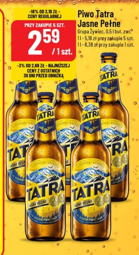 Piwo Tatra Jasne Pełne Grupa Żywiec, 0,5 | but. zwr.” 1l - 5,18 zł przy zakupie 5 szt. 1l - 6,38 zł przy zakupie 1 szt.