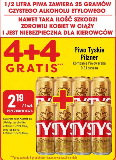 Piwo Tyskie Pilzner Kompania Piwowarska 0,5 | puszka najniższa cena z ostatnich 30 dni przed obniżką: 2,99 zł/szt., 26% taniej cena regularna: 4,39 zł/szt., 50% taniej