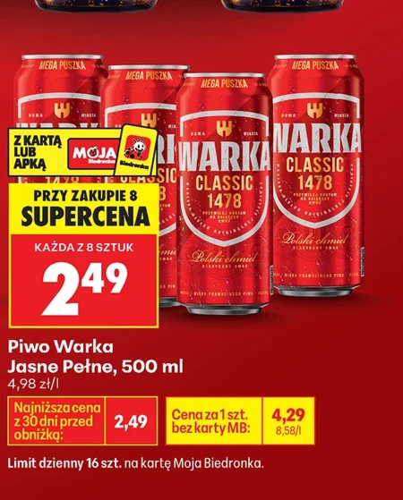 Piwo Warka Jasne Pełne, dostępne w ofercie Biedronka, kosztuje 4,98 zł za litr. Przy zakupie ośmiu butelek o pojemności 500 ml, cena za każdą sztukę spada do 2,49 zł, a limit dzienny na kartę Moja Biedronka wynosi 16 sztuk. To klasyczne, jasne piwo pełne, idealne do orzeźwienia w cieplejsze dni lub jako dodatek do spotkań z przyjaciółmi. Aktualna cena jest znacznie niższa niż najniższa z ostatnich 30 dni, kiedy to butelka kosztowała 2,49 zł, co sprawia, że to wyjątkowa okazja. Oferta ważna od 2026-04-09 do 2026-04-15 Źródło: gazetka Biedronka