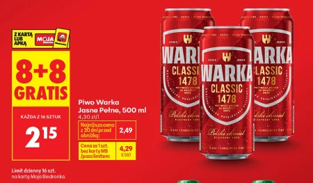 Piwo Warka Jasne Pełne, butelka 500 ml, dostępne w ofercie Biedronka w cenie 2,15 zł przy zakupie dwóch sztuk, dzięki akcji 8+8 gratis z kartą lub aplikacją. Klasyczne, jasne piwo pełne, idealne do orzeźwienia w cieplejsze dni lub jako dodatek do posiłków. Promocja pozwala zaoszczędzić, nabywając zapas ulubionego piwa w korzystnej cenie – pamiętaj o limicie dziennym 16 sztuk na kartę Moja Biedronka. Najniższa cena z ostatnich 30 dni wynosiła 2,49 zł, a standardowa cena bez promocji to 4,29 zł. Oferta ważna od 2026-04-13 do 2026-04-18 Źródło: gazetka Biedronka