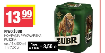 Piwo ŻUBR występuje w ofercie EUROSPAR w cenie 13,99 zł za opakowanie zawierające cztery puszki po 500 ml, co daje 3,50 zł za puszkę w 4-paku. Jest to klasyczne piwo w wygodnej formie puszki, idealne na spotkania ze znajomymi lub relaks w domu. Produkt Kompanii Piwowarskiej to propozycja dla osób ceniących tradycyjny smak. Warto skorzystać z tej okazji, aby zaopatrzyć się w ulubione piwo w korzystnej cenie. Oferta ważna od 2026-04-08 do 2026-04-19 Źródło: gazetka EUROSPAR