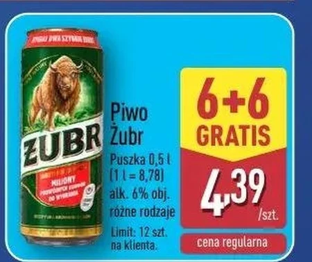 Piwo Żubr dostępne jest w ofercie Aldi w cenie 4,39 zł za puszkę 0,5 l, przy zakupie 6 puszek druga sztuka jest gratis. To klasyczne piwo o zawartości alkoholu 6% objętości, idealne do orzeźwienia w cieplejsze dni lub jako dodatek do spotkań ze znajomymi. W sprzedaży dostępne są różne rodzaje piwa Żubr, jednak obowiązuje limit 12 puszek na jednego klienta. Promocja pozwala zaopatrzyć się w zapas ulubionego piwa w korzystnej cenie, więc warto sprawdzić dostępność i skorzystać z okazji. Oferta ważna od 2026-04-30 do 2026-05-02 Źródło: gazetka Aldi
