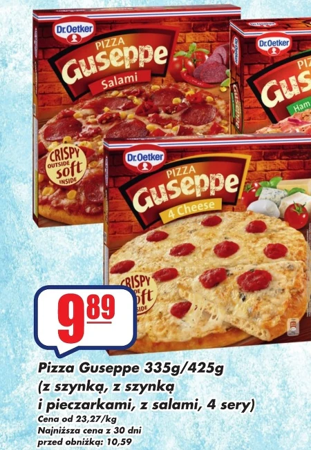 Pizza Guseppe 335g/425g (z szynką, z szynką i pieczarkami, z salami, 4 sery) Cena od 23,27/kg Najniższa cena z 30 dni przed obniżką: 10,59