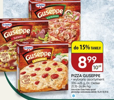 PIZZA GUSEPPE · wybrany asortyment 335-425 g, Dr. Oetker 21,15-26,84/kg Cena w sieci Chata Polska sprzed pierwszego zastosowania obniżki: 10,29-10,59 zł.
