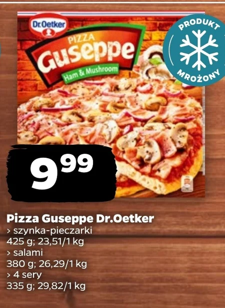 Pizza Guseppe Dr.Oetker > szynka-pieczarki 425 g; 23,51/1 kg > salami 380 g; 26,29/1 kg > 4 sery 335 g; 29,82/1 kg