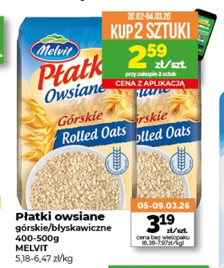 Płatki owsiane górskie/błyskawiczne 400-500g MELVIT 5,18-6,47 zł/kg