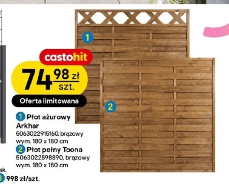 Płot ażurowy Arkhar i płot pełny Toona występują w ofercie Castorama w cenie 74,98 zł za sztukę. Oba płoty są w kolorze brązowym i mają wymiary 180 x 180 cm, co pozwala na stworzenie solidnej i estetycznej ogrodzeniowej bariery. Oferowane zestawy sprawdzą się do wygrodzenia posesji, ogrodu lub stworzenia elementów małej architektury krajobrazowej. To wyjątkowa okazja, ponieważ oferta jest limitowana, więc warto rozważyć zakup, jeżeli poszukujesz gotowych elementów do budowy ogrodzenia w atrakcyjnej cenie. Wybierz płot ażurowy, aby zapewnić prywatność, zachowując jednocześnie przepływ powietrza, lub płot pełny, który gwarantuje pełne osłonięcie. Oferta ważna od 2026-04-07 do 2026-04-21 Źródło: gazetka Castorama