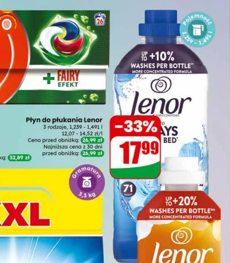 Płyn do płukania Lenor 3 rodzaje, 1,239 l - 1,491 l 12,07 - 14,52 zł/1l Cena przed obniżką: 26,99 zł Najniższa cena z 30 dni przed obniżką: 26,99 zł -33% 17,99 zł