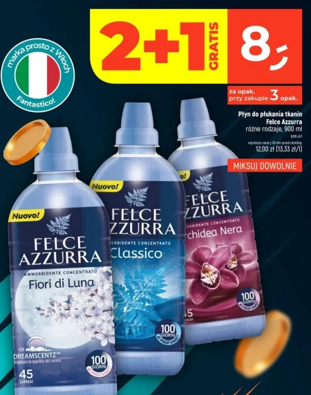 Płyn do płukania tkanin Felce Azzurra różne rodzaje, 900 ml 0,09 zł/l najniższa cena z 30 dni przed obniżką: 12,00 zł (13,33 zł/l)