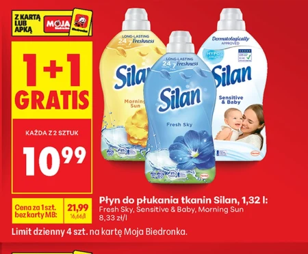 Płyn do płukania tkanin Silan w Biedronce kosztuje obecnie 10,99 zł za opakowanie 1,32 l, co daje 8,33 zł/l, dzięki promocji 1+1 GRATIS – kupujesz dwie sztuki, a płacisz za jedną. Cena za jedną sztukę bez karty Moja Biedronka to 21,99 zł, czyli 16,66 zł/l. Można go wykorzystać do zmiękczania tkanin podczas prania, zachowując ich świeżość i zapach, a limit dzienny to 4 sztuki na kartę Moja Biedronka. Promocja dostępna w najnowszej gazetce Biedronka.