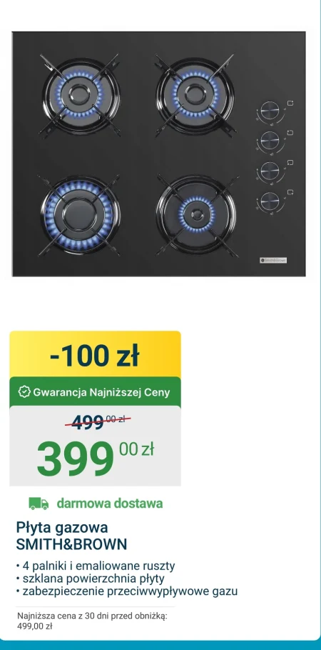 Płyta gazowa SMITH&BROWN · 4 palniki i emaliowane ruszty · szklana powierzchnia płyty · zabezpieczenie przeciwwypływowe gazu Najniższa cena z 30 dni przed obniżką: 499,00 zł