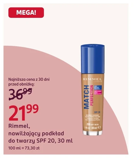 Rimmel, nawilżający podkład do twarzy SPF 20, 30 ml 100 ml = 73,30 zł