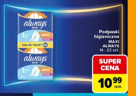 Podpaski higieniczne MAXI ALWAYS 14 - 22 szt. SUPER CENA 10,99 opak. Always Maxi podpaski higieniczne dostępne są teraz w Carrefourze w supercenie 10,99 zł za opakowanie. Gazetka promocyjna Carrefour informuje o atrakcyjnej ofercie na te podpaski, których opakowanie zawiera od 14 do 22 sztuk. Dzięki tej promocji możesz zaopatrzyć się w niezbędne produkty higieniczne w bardzo korzystnej cenie, zapewniając sobie komfort i ochronę podczas menstruacji. To idealny moment, by zrobić zapas na kilka cykli.