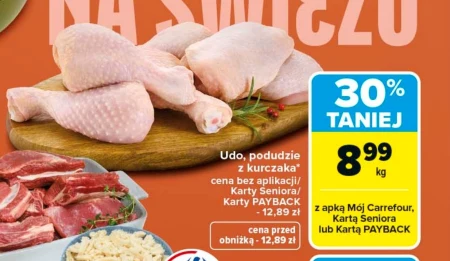 Udo, podudzie z kurczaka* 30% TANIEJ 8,99 kg cena bez aplikacji/ Karty Seniora/ Karty PAYBACK - 12,89 zł z apką Mój Carrefour, Kartą Seniora lub Kartą PAYBACK cena przed obniżką - 12,89 zł W Carrefourze podudzia z kurczaka Udo dostępne są teraz w promocyjnej cenie 8,99 zł za kilogram, co stanowi 30% zniżki. Można je wykorzystać do przygotowania wielu różnorodnych dań, od pieczonych udek po aromatyczne gulasze. Obniżka obowiązuje zarówno przy zakupie bez aplikacji, jak i z wykorzystaniem aplikacji Mój Carrefour, Karty Seniora lub Karty PAYBACK, gdzie cena spada do 12,89 zł z ceny regularnej 12,89 zł. To okazja, by zaopatrzyć się w ten popularny drób w atrakcyjnej cenie.