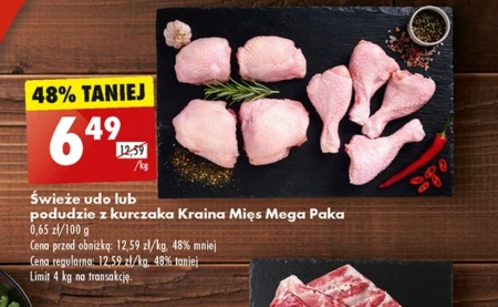Świeże udo lub podudzie z kurczaka Kraina Mięs Mega Paka 0,65 zł/100 g Cena przed obniżką: 12,59 zł/kg, 48% mniej Cena regularna: 12,59 zł/kg, 48% taniej Limit 4 kg na transakcję.