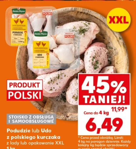 Podudzie lub udo z polskiego kurczaka jest dostępne w Kaufland w cenie 11,99 za 1 kg, teraz aż 45% taniej, czyli 6,49. Można je nabyć zarówno na stoisku z obsługą, jak i w strefie samoobsługowej, zarówno pojedynczo, jak i w opakowaniach XXL. Ten świeży drób idealnie sprawdzi się w codziennym gotowaniu, nadając wyśmienitego smaku potrawom takim jak pieczony kurczak, gulasz czy rosół. Pamiętaj o limicie zakupu – maksymalnie 4 kg na paragon, każdy kolejny kilogram w cenie regularnej. Oferta ważna od 2026-04-13 do 2026-04-15 Źródło: gazetka Kaufland