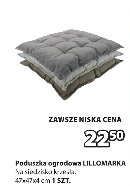 Poduszkę ogrodową LILLOMARKA kupisz w Jysk za 22,50 zł za sztukę. Produkt przeznaczony jest na siedzisko krzesła i ma wymiary 47x47x4 cm. Poduszka ta zapewni komfort podczas odpoczynku na świeżym powietrzu, a jej praktyczny rozmiar sprawia, że pasuje do wielu rodzajów krzeseł ogrodowych. Warto skorzystać z tej okazji, aby stworzyć przyjemną atmosferę w swoim ogrodzie. Oferta ważna od 2026-04-22 do 2026-05-10 Źródło: gazetka Jysk