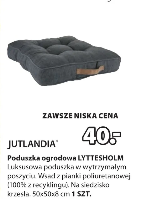 Poduszkę ogrodową LYTTESHOLM marki JUTLANDIA® można nabyć w ofercie Jysk w cenie 40,00 zł za sztukę. Wytrzymała poduszka na siedzisko krzesła posiada poszycie odporne na warunki atmosferyczne oraz wsad z pianki poliuretanowej wykonanej w 100% z recyklingu. Wymiary poduszki to 50x50x8 cm, co zapewnia komfort użytkowania na tarasie lub w ogrodzie. To okazja, aby wygodnie urządzić przestrzeń wypoczynkową na świeżym powietrzu. Oferta ważna od 2026-04-22 do 2026-05-10 Źródło: gazetka Jysk