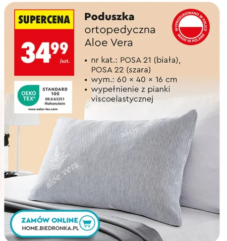 Poduszkę ortopedyczną Aloe Vera można nabyć w Biedronce w super cenie 34,99 za sztukę. Wykonana z pianki viscoelastycznej, o wymiarach 60 x 40 x 16 cm, zapewnia komfortowy i ergonomiczny sen, dopasowując się do kształtu głowy i szyi. Poduszka posiada certyfikat Oeko-Tex Standard 100, gwarantujący bezpieczeństwo i brak szkodliwych substancji, a także została wyprodukowana w Polsce. Skorzystaj z tej okazji i zadbaj o swój zdrowy sen. Oferta ważna od 2026-04-11 do 2026-04-29 Źródło: gazetka Biedronka