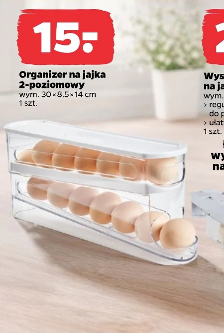 Organiser na jajka jest dostępny w ofercie Netto w cenie 15,- za sztukę. Ten dwupoziomowy pojemnik o wymiarach 30 x 8,5 x 14 cm to praktyczne rozwiązanie do przechowywania jaj w kuchni, utrzymując je w jednym miejscu i chroniąc przed stłuczeniem. Uporządkowany dostęp do jajek ułatwi codzienne przygotowywanie posiłków. To okazja, żeby zadbać o porządek w lodówce w atrakcyjnej cenie.