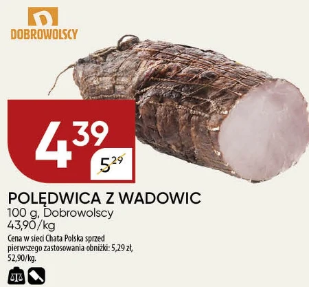 POLĘDWICA Z WADOWIC 100 g, Dobrowolscy 43,90/kg Cena w sieci Chata Polska sprzed pierwszego zastosowania obniżki: 5,29 zł, 52,90/kg.