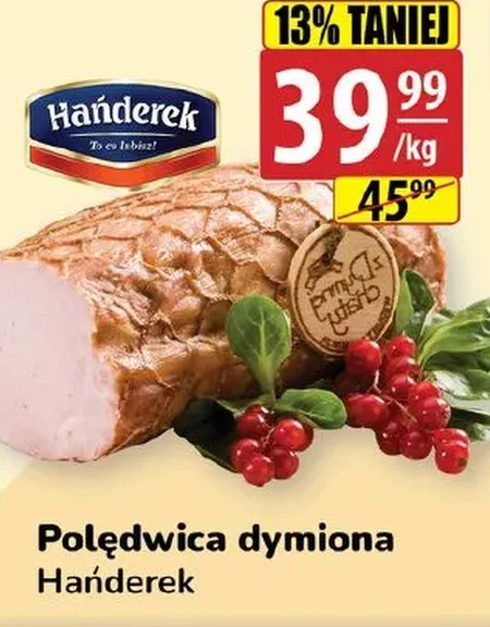 Pojędwica dymiona Hańderek w Api Market dostępna jest teraz w cenie 39,99 zł za kilogram zamiast 45,99 zł, co oznacza 13% zniżkę. Produkt sprzedawany jest na wagę, a obniżka dotyczy ceny za kilogram. Pojędwica dymiona Hańderek idealnie sprawdzi się jako dodatek do kanapek lub składnik deski wędlin. Promocja obowiązuje w sklepie Ara.