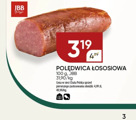 POLĘDWICA ŁOSOSIOWA 100 g, JBB 31,90/kg Cena w sieci Chata Polska sprzed pierwszego zastosowania obniżki: 4,99 zł, 49,90/kg.