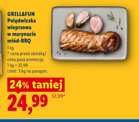 GRILL&FUN Polędwiczka wieprzowa w marynacie miód-BBQ 1 kg * cena przed obniżką/ cena poza promocją: 1 kg = 32,99 Limit: 3 kg na paragon.