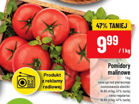 Pomidory malinowe 1 kg cena sprzed pierwszego zastosowania obniżki: 18,99 zł/kg, 47% taniej cena regularna: 18,99 zł/kg, 47% taniej Pomidory malinowe to doskonały dodatek do sałatek, które wzbogacą je o świeży smak oraz intensywny kolor. Można je również wykorzystać do przygotowania aromatycznego sosu lub zupy, co podkreśli ich naturalną słodycz i soczystość.