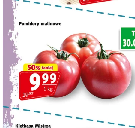 Pomidory malinowe występują w ofercie Prim Market w cenie 9,99 zł za kilogram, co stanowi 50% zniżki względem ceny regularnej 19,99 zł. Te wyjątkowo smaczne pomidory idealnie nadają się do sałatek, sosów, kanapek, a także do bezpośredniego spożycia. Cechują się słodkim, delikatnym smakiem i atrakcyjnym kolorem, dodając koloru i aromatu codziennym posiłkom. Warto skorzystać z tej okazji i zaopatrzyć się w te wyśmienite warzywa w tak korzystnej cenie. Oferta ważna od 2026-04-30 do 2026-05-06 Źródło: gazetka Prim Market