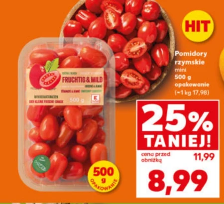 Pomidory rzymskie mini 500 g opakowanie (-1 kg 17,98) Miniaturowe pomidory rzymskie stanowią idealny dodatek do sałatek, pasta czy wykwintnych dań kuchni śródziemnomorskiej, a ich słodki smak i delikatna tekstura zachowują się doskonale przez długi czas przechowywania. Bezpośrednio z opakowania możesz je dodawać do przystawek, przekąsek czy koktajli warzywnych, korzystając z ich bogatej zawartości likopenu, witaminy C i przeciwutleniaczy wspierających zdrowie.