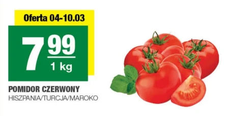 POMIDOR CZERWONY HISZPANIA/TURCJA/MAROKO Świeże, soczyste pomidory czerwone z Hiszpanii, Turcji lub Maroka są idealne do przygotowania pysznych sałatek, zup oraz sosów, stanowiąc bazę wielu dań kuchni śródziemnomorskiej. Wykorzystaj je w przetworach, takich jak domowy ketchup czy przecier pomidorowy, by cieszyć się smakiem lata przez cały rok, dodając naturalnego aromatu i koloru Twoim potrawom. Bogactwo likopenu w czerwonych pomidorach to również doskonały sposób na dbanie o zdrowie i wzmocnienie odporności, wpisując je w zdrową dietę.