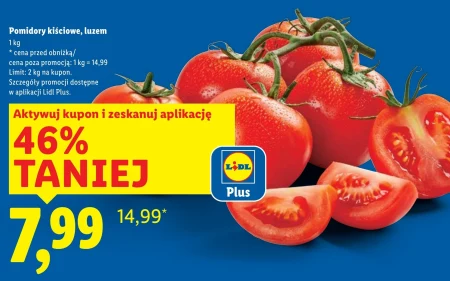 Pomidory kiściowe, luzem 1 kg * cena przed obniżką/ cena poza promocją: 1 kg = 14,99 Limit: 2 kg na kupon. Szczegóły promocji dostępne w aplikacji Lidl Plus.