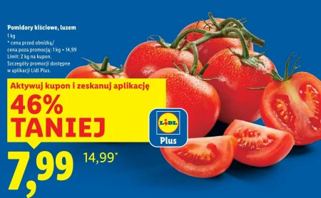 Pomidory kiściowe, luzem 1 kg * cena przed obniżką/ cena poza promocją: 1 kg = 14,99 Limit: 2 kg na kupon. Szczegóły promocji dostępne w aplikacji Lidl Plus.
