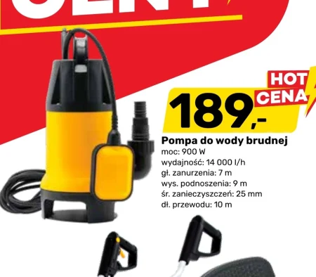Pompa do wody brudnej moc: 900 W wydajność: 14 000 l/h gł. zanurzenia: 7 m wys. podnoszenia: 9 m śr. zanieczyszczeń: 25 mm dł. przewodu: 10 m