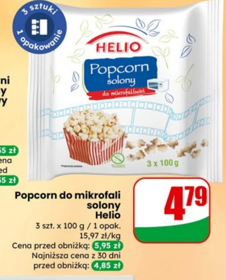 Popcorn do mikrofali solony Helio 3 szt. x 100 g / 1 opak. 15,97 zł/kg Cena przed obniżką: 5,95 zł Najniższa cena z 30 dni przed obniżką: 4,85 zł