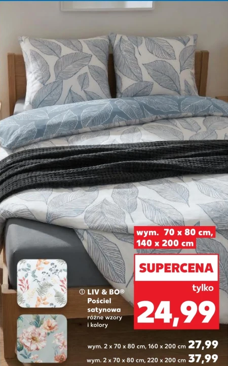 Pościel satynowa LIV & BO® dostępna jest w Kauflandzie w cenie 24,99 zł za komplet w rozmiarze 70x80 cm lub 140x200 cm. Pościel występuje w różnych wzorach i kolorach, co pozwoli dopasować ją do wystroju sypialni. Można ją wykorzystać do odświeżenia wyglądu łóżka i zapewnienia komfortowego snu. W ofercie Kauflandu znajdziesz również komplety w rozmiarach 2x70x80 cm z prześcieradłami 160x200 cm w cenie 27,99 zł oraz 2x70x80 cm z prześcieradłami 220x200 cm za 37,99 zł. To okazja, aby za niewielkie pieniądze odmienić swoją sypialnię i cieszyć się luksusowym materiałem.