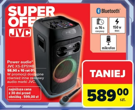 JVC XS-EP514B Power audio jest dostępne w Carrefour w cenie 589,00 zł, z możliwością zakupu na 10 rat 0%. To urządzenie zapewnia mocne brzmienie dzięki mocy 150 W oraz łączność Bluetooth, umożliwiając odtwarzanie muzyki bezprzewodowo przez nawet 16 godzin. Wbudowany mikrofon pozwala na prowadzenie rozmów. W promocji dostępne są również inne zestawy audio marki JVC, a aktualna cena jest najniższa od 30 dni - obniżka z 599,00 zł. Skorzystaj z okazji i ciesz się ulubioną muzyką w wysokiej jakości. Oferta ważna od 2026-04-13 do 2026-05-02 Źródło: gazetka Carrefour