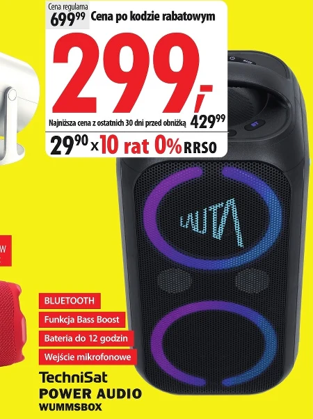 TechniSat POWER AUDIO WUMMSBOX jest dostępny w ofercie Media Expert w cenie 299,- zamiast 699,99. Najniższa cena z ostatnich 30 dni wynosiła 429,99. Ten przenośny głośnik Bluetooth to idealne rozwiązanie dla miłośników muzyki, którzy chcą zabrać swoje ulubione utwory w każde miejsce. Urządzenie wyróżnia się funkcją Bass Boost, która wzmacnia basy, zapewniając mocne i wyraźne dźwięki, a także możliwością podłączenia mikrofonu. Wbudowana bateria pozwala na nawet dwunastogodzinne odtwarzanie muzyki bez konieczności ładowania. To wyjątkowa okazja, aby nabyć wysokiej jakości głośnik w bardzo atrakcyjnej cenie. Dodatkowo, możesz rozłożyć płatność na 10 rat 0% z RRSO 0%. Oferta ważna od 2026-04-09 do 2026-04-18 Źródło: gazetka Media Expert