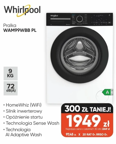 Pralka WAM99WBB PL · HomeWhiz (WiFi) · Silnik inwerterowy · Opóźnienie startu · Technologia Sense Wash · Technologia Al Adaptive Wash