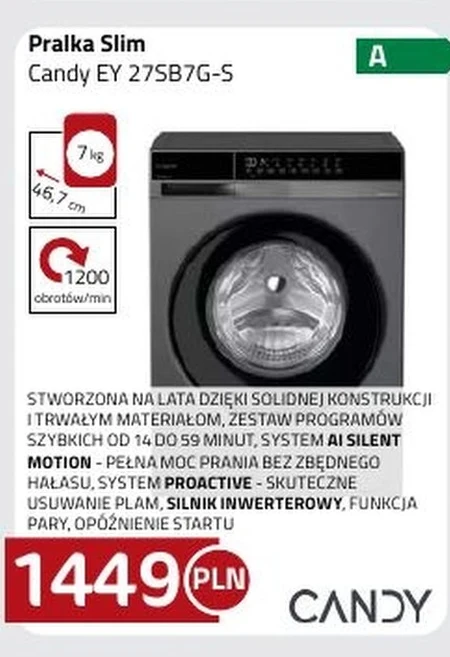 Pralka Slim Candy EY 27SB7G-S STWORZONA NA LATA DZIĘKI SOLIDNEJ KONSTRUKCJI I TRWAŁYM MATERIAŁOM, ZESTAW PROGRAMÓW SZYBKICH OD 14 DO 59 MINUT, SYSTEM AI SILENT MOTION - PEŁNA MOC PRANIA BEZ ZBĘDNEGO HAŁASU, SYSTEM PROACTIVE - SKUTECZNE USUWANIE PLAM, SILNIK INWERTEROWY, FUNKCJA PARY, OPÓŹNIENIE STARTU