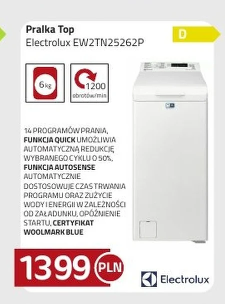 Pralka Top Electrolux EW2TN25262P 14 PROGRAMÓW PRANIA, FUNKCJA QUICK UMOŻLIWIA AUTOMATYCZNĄ REDUKCJĘ WYBRANEGO CYKLU O 50%, FUNKCJA AUTOSENSE AUTOMATYCZNIE DOSTOSOWUJE CZAS TRWANIA PROGRAMU ORAZ ZUŻYCIE WODYIENERGII WZALEŻNOŚCI OD ZAŁADUNKU, OPÓŹNIENIE STARTU, CERTYFIKAT WOOLMARK BLUE