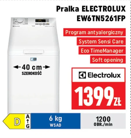 Pralka ELECTROLUX EW6TN5261FP w Neopunkt dostępna jest teraz za 1399 zł. Ten model o głębokości 40 cm pomieści 6 kg wsadu i osiąga prędkość wirowania 1200 obrotów na minutę, a program antyalergiczny zapewnia higienę prania. Wykorzystasz ją do efektywnego i delikatnego prania ubrań w domu, korzystając z funkcji takich jak Sensi Care i Eco TimeManager.