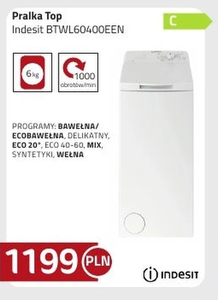Pralka Top Indesit BTWL60400EEN PROGRAMY: BAWEŁNA/ ECOBAWEŁNA, DELIKATNY, ECO 20°, ECO 40-60, MIX, SYNTETYKI, WEŁNA